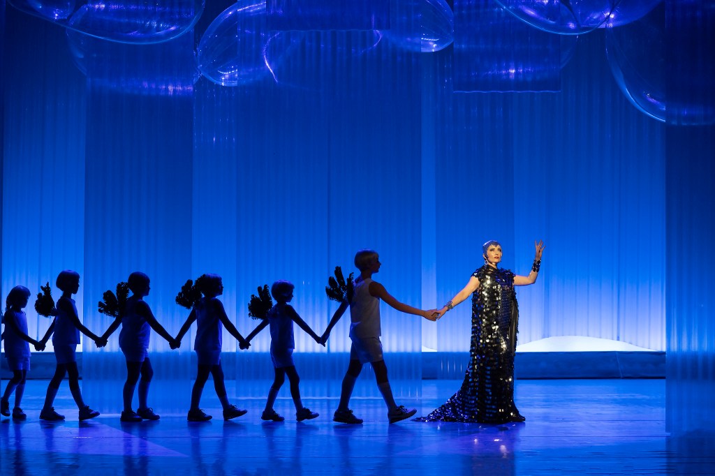 Shining through the silvery set are Oberon and Tytania’s stunningly glitzy outfits – their heads cleaved helmet-like in shimmering fabrics and Oberon’s armour blinding the audience with its mirror ball effect – aesthetically pleasing but a tad too reflective for my taste. Similarly, while matching the eerieness, the Village of the Damned-inspired winged blonde identical fairies were also an odd choice, their choir sounded enchanting yet many of them looked drained (it was a late show after all).