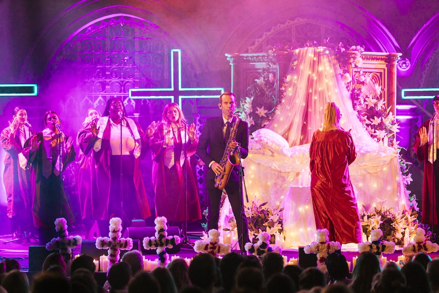 The design cannot be lost on anyone. It was symbolic, stunning and stylised to perfectly capture the romantic intensity needed, drawing on the film’s heavily religious symbolism, the full choir reflected this through their vocal perfection and church attire. I wanted to see more consideration to the ’90s hip-hop elements and its juxtaposition to iconic Christian symbolism in the physical design but am aware this may be reserved for more theatrical events.
