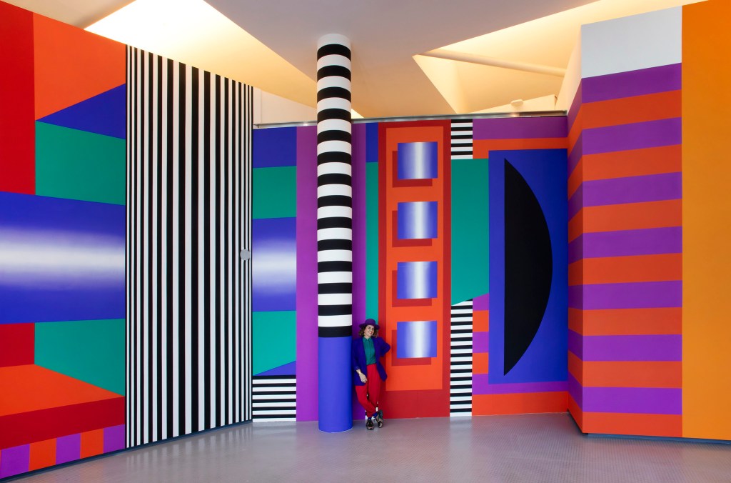 The enormous piece spans several walls, with curved columns and sharp angular corners blending seamlessly with the evocative false 3D perspectives of Walala’s piece.