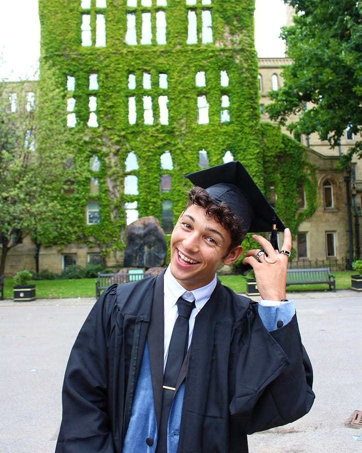 “Well, I don’t know what it was like not doing it whilst I was at uni,” he admitted. “Well, I did, ’cause then I finished uni [but] I didn’t realise how much work I was doing until the whole thing was over. It was a lot of work. It was really hard. But also, it was really fun. Because it was the middle of the pandemic, and a lot of stuff had gone back, but universities were still remote, so it meant that I could actually do it because Channel 4 and University of Manchester worked their schedules around each other, so I was able to sit in my dressing room and do a lecture on Zoom and go to set and film some stuff… I wrote half my dissertation on the back of my scripts on set.”